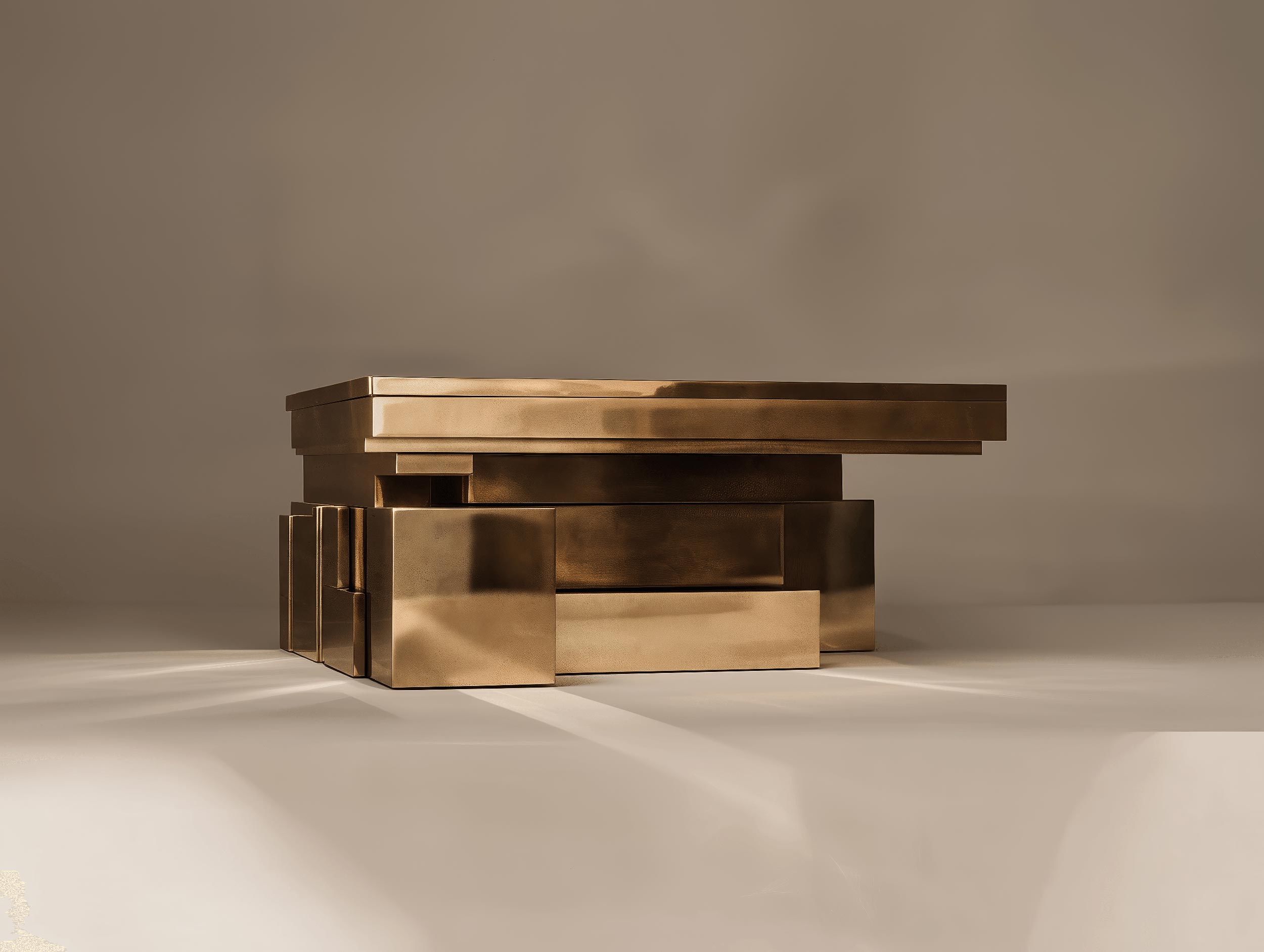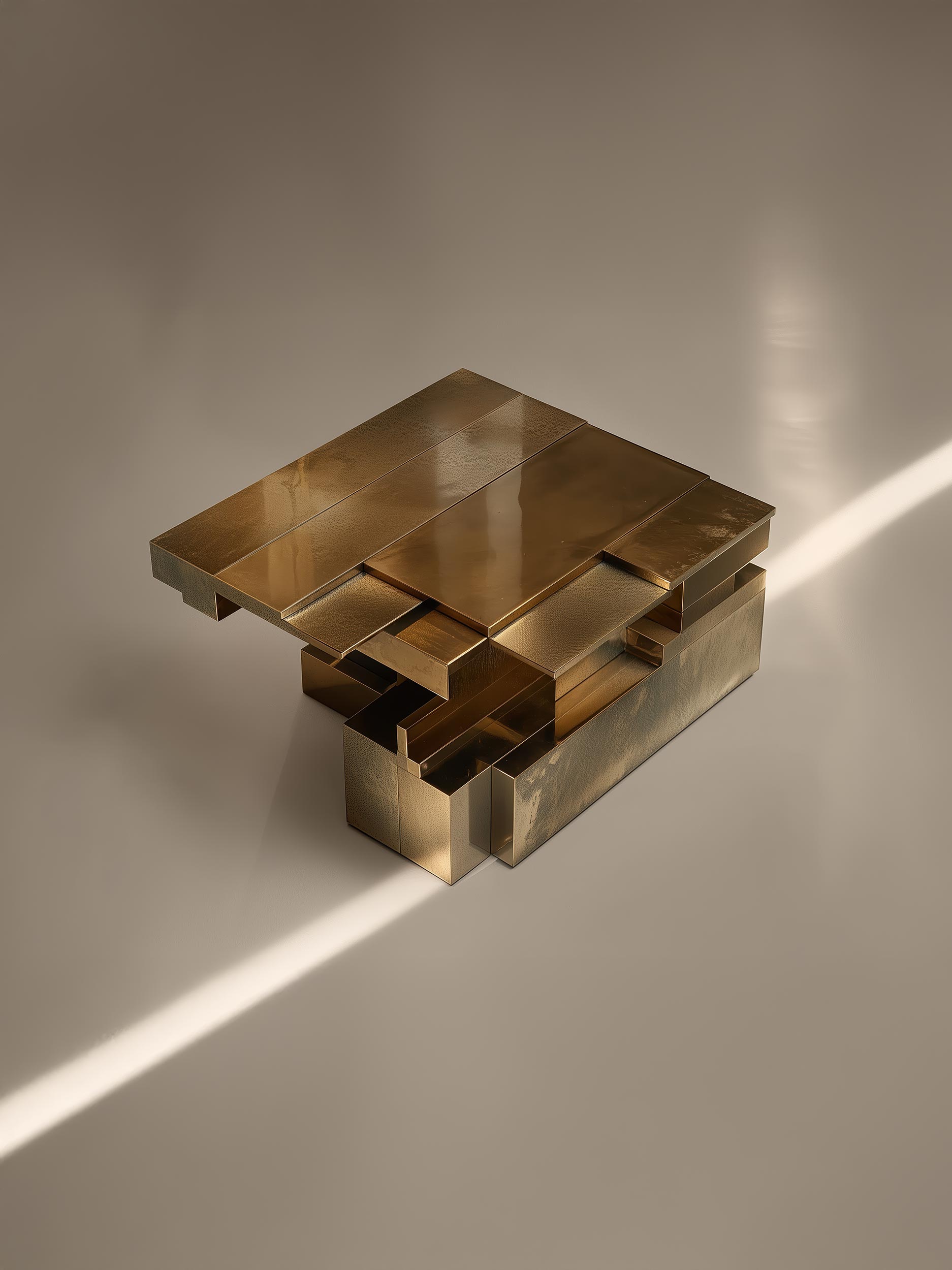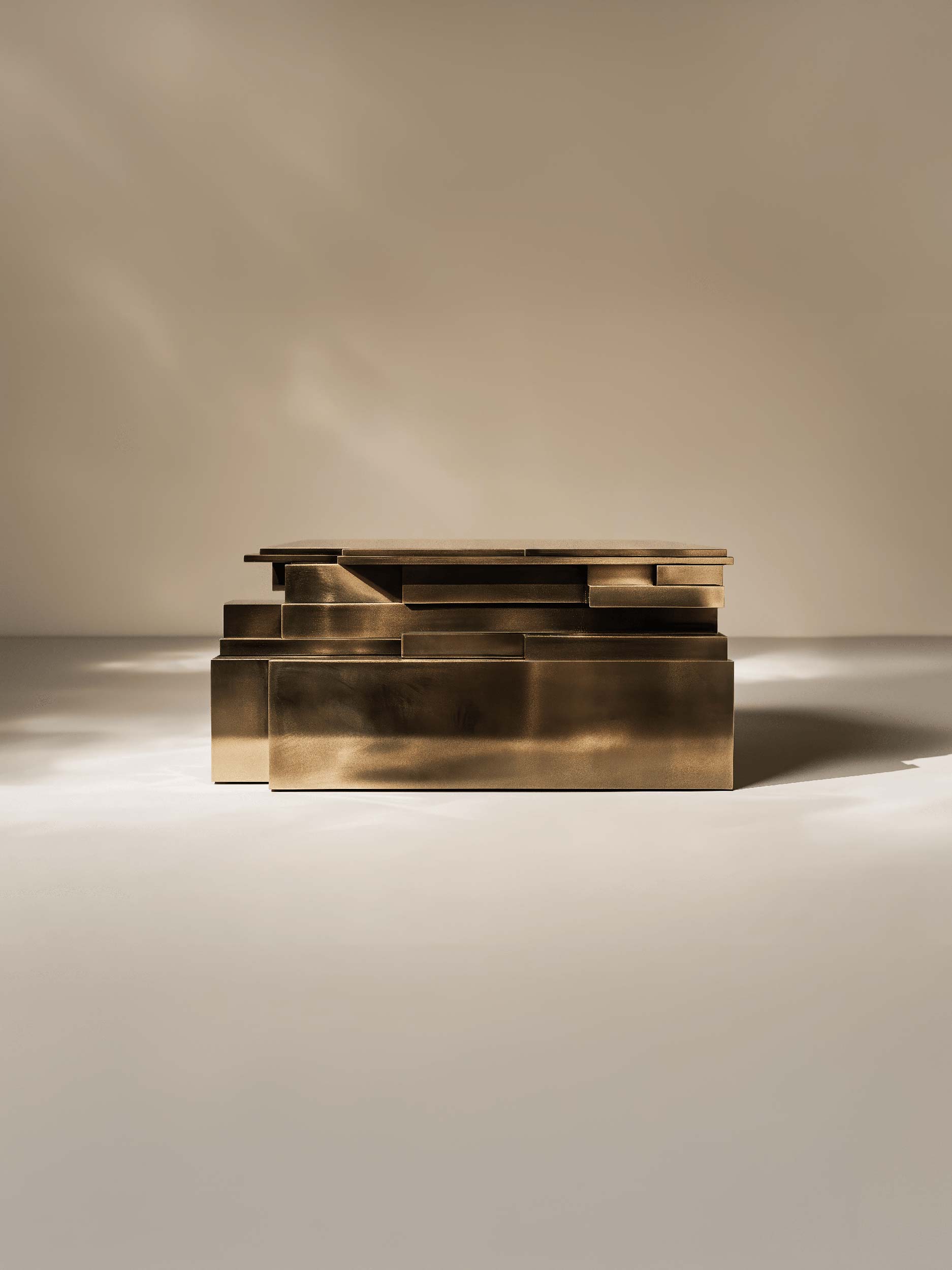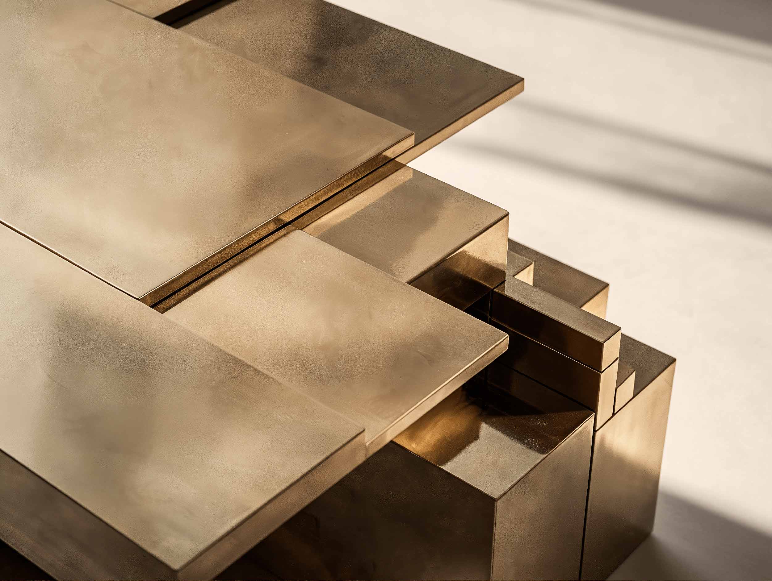 Umbrae is a collection of bronze tables where stillness is gently unsettled. Composed of solid panels and blocks, each piece remains grounded—until, in select places, the geometry slips. These quiet displacements fracture the surface and invite a shift in perception, casting soft shadows that echo the tension between presence and absence.